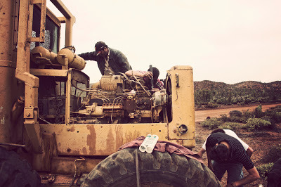 PIX of the DAYA random tractor, broken down, hours from a paved road and in the middle of the Baja desert. This is one of my favorite parts in our documentary. Here we talk with a dude named Ruben who tells about a "far away fish camp" known for drug smuggling. Without this random encounter we wouldn't have been able to interview a smuggler in our film. Photo by Derren Ohanian / http://www.dnaimagery.com/