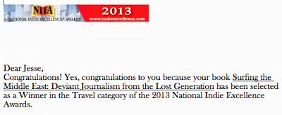 It's award season and Surfing the Middle East has won another one. This time it's from the 2013 National Indie Excellence Awards. Best in the travel section. I've noticed they haven't updated their website with this years winners yet . . . so I'll do the old email screen shot. See below.
