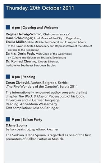 Zoran My latest novel, published in March 2011, is titled The Five Wonders of the Danube. (The Danube is the second-greatest European river. I can see it from one of my windows…) The novel takes place on five imaginary Danube bridges — in Regensburg (Germany), Vienna (Austria), Bratislava (Slovakia), Budapest (Hungary) and Novi Sad (Serbia). The story begins with a huge painting appearing one morning, out of nowhere, on the Black Bridge in Regensburg…