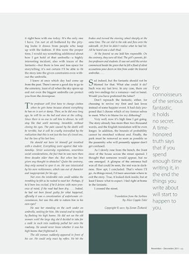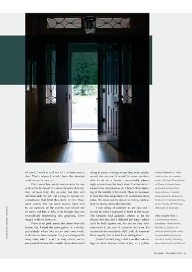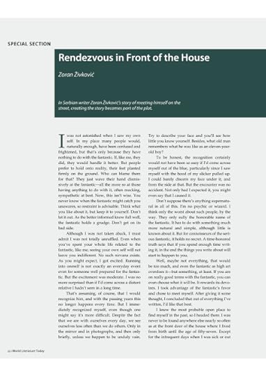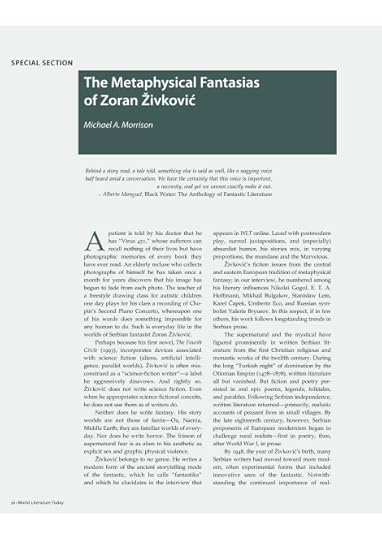 The special section contains a biographical sketch, Zoran Zivkovic's new story "Rendezvous in Front of the House" and Professor Michael A. Morrison's essay "The Metaphysical Fantasias of Zoran Zivkovic."