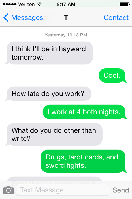 So he stopped in later, and my friend Lacy and Corrinne also showed up, so they all sat at the bar together and got to know one another. Normally I would say it's to a guy's credit that he can hang out and have an ongoing, good conversation with a date's friends (because that stuff can be awkward and pressurized and weird), but it's more to a guy's discredit if you can't have a great conversation with my friend Lacy - she's probably one of the best conversationists I've ever met, so if things are awkward, it's because you're making it that way. Luckily for Peace Train, it looked like they were hitting it off. He stuck around until after I was done with my shift, so we had a drink together and talked for a while longer before I announced that it was time for me to hang it up and go home. There was no awkward hug or anything, which was a relief, and he sent me a text later that night that could not have been more innocuous: "Hey. Got home. Hayward was cool. Minnow is a nice place. Glad I could talk with you."