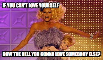 Sinking down further into the couch, my teenage self frowned at the TV and then at the crumbs that had just fallen on the chestal area of my t-shirt. Taking another absent-minded munch from my chocolate chip cookie, I watched as RuPaul broke out into the grapevine, her platinum blonde wig bouncing as she stepped lightly in her stilettos heels, her backup dancers following suit. She always ended her new Vh1 talk show with this directive, and it always annoyed me. It would be easier to love myself if I was in love with someone else, I wanted to argue. Isn’t that kind of the point? Love makes you feel better and cooler and prettier than you feel on your own, right? That’s why everyone wants it!Objectively, I got it. You have to love yourself before you can love someone else. But it kind of felt like choosing a bottle of apple juice over Diet Coke for lunch, or eschewing the free Snickers Bar in favor of a banana...like you were basically choosing total lamesauce. How does a relationship with yourself become as or more satisfying than a relationship with someone else? Isn’t it kind of boring? You can’t kiss your own mouth. Slow dancing with yourself is also kind of awkward. You can take yourself out on dates, but it’s not as much fun if there’s no one across from you, telling you how good you look.