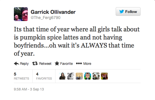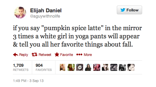 I'm kind of loving all these Twitter digs on girls and their fanatic love for Pumpkin Spice Lattes.Only because, as a girl who fanatically loves Pumpkin Spice Lattes, I can say that they're funny because they're true.