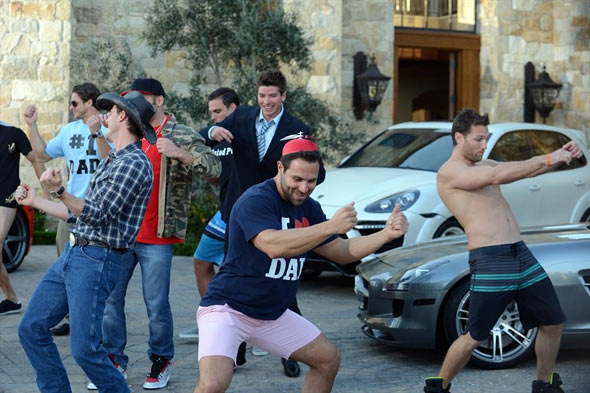 The Rosebuds pull up to a garage. Des is wearing gym gear. The guys think she looks "gorgeous, as usual." This is nice, since it means that they have super low standards and it gives me hope that I can spend the rest of my romantic life in yoga clothes and still get laid, as per my dream. Des opens the garage door to reveal a dodgeball team. Some captain reads a bunch of stuff off a cue card about this being "the real deal", and guys start throwing balls at the wall and talk about how this is like being on the A-Team, which is hilarious, because there's no way Mr. T would ever let a fool even try and throw a ball at his face.