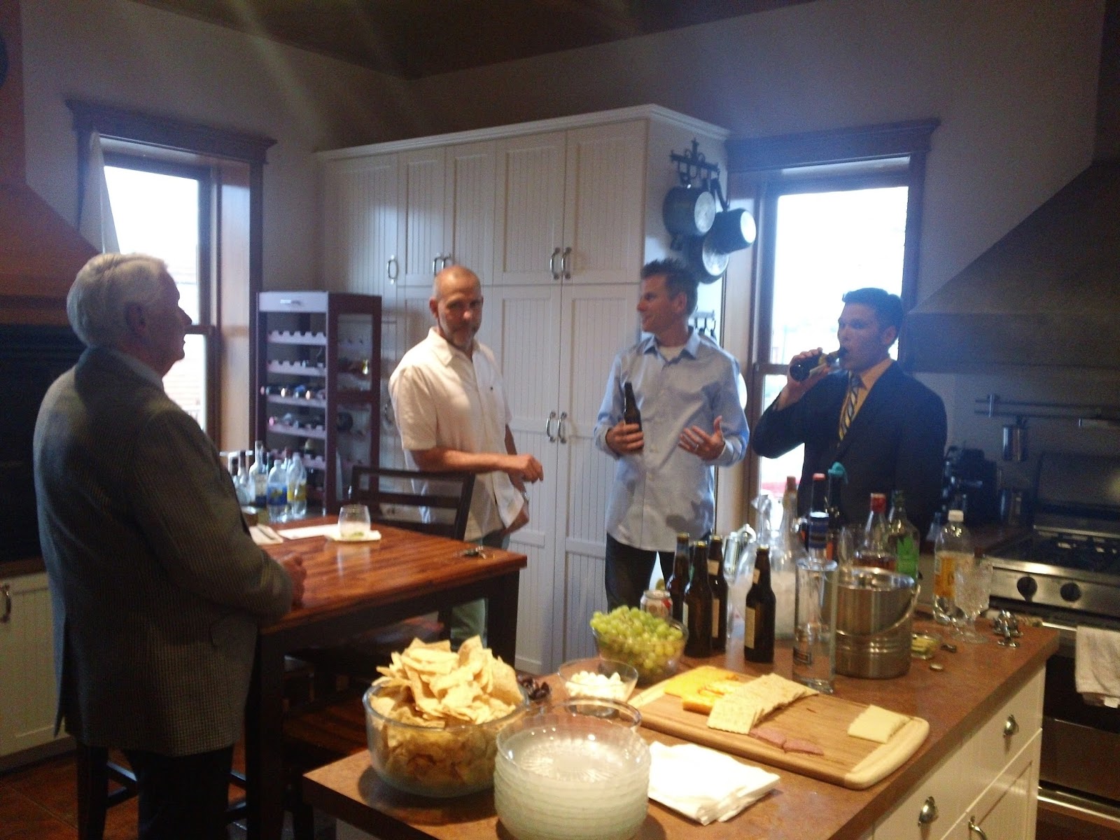 Calendar Men Chuck, James, Tim, and Craig in the kitchen, drinking beers and talking about stuff that men talk about.