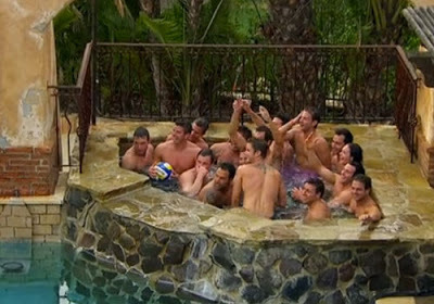 Chris calls the guys into the living room and announces that the cocktail party has been canceled, and instead, Des is inviting them to a casual, relaxed pool party.