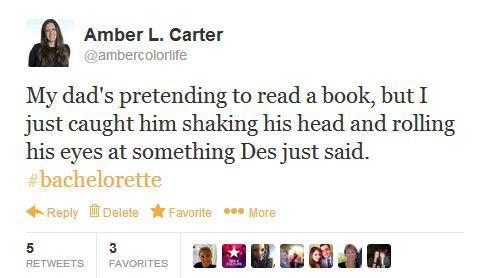 But apparently, it's poor form to interrupt The Most Boring Faux-Deep Convo Ever, as Ben sadly learned that evening. Even though he already had a rose, Playa played it like every other champ in history and still decided to interrupt some other chump's time with Des for some connecting time of his own. Only this time it was Mike G getting the shaft, and he did not appreciate it, Ben! He was in the middle of a tearful confession about his body's intolerance to glucose, and you ruined it! So the guys all gang up on Ben and accuse him of not being genuine. It's probably the most boring group-gang-up in Bachelor history. And then a tweet of mine was posted on the show, so I literally lost all interest and didn't pay attention again until the rose ceremony.
