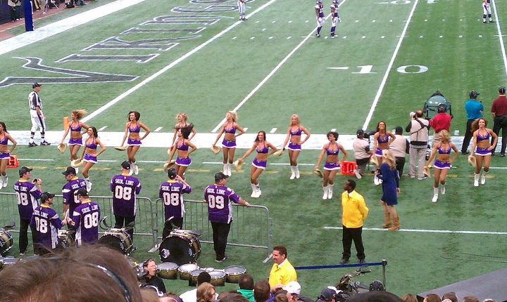 Photo Credit: Mike SjodinLike, WTF, cheerleaders. And not even cheerleaders...WTF, Organization That Decides On The Costume Choices For Cheerleaders. I'm no prude. And I'm part of the feminist camp that believes that feminism is about the freedom to make your own choices vs. the freedom for me to tell my fellow sisters what I think those choices should be. But these costumes...you guys, this is ridiculous. I understand that NFL cheerleaders are meant to basically be just bouncy entertainment. I get it - though more on that in a minute - and to be fair, I wish the broadcasted games would show more of the cheerleading action, because frankly, it's the only part of the game that I truly enjoy. However, WHAT THE FUCK IS UP WITH THESE COSTUMES. Why are you even having them wear clothes? Why not just some white tassles and a purple g-string? Because you're making a mockery out of all of us. These look like cheerleader uniforms...if they had gotten stuck in the dryer on high for about seventeen days, or if you had mistakenly grabbed your 5-year-old niece's adorable Halloween costume instead. Isn't it kind of weird when the boots cover more skin than the entire costume combined? And it's November, right? As in, winter. These are not even seasonal!