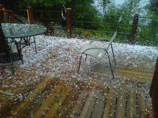 It came during dinner - a sprinkling, then a breezy rain, then the wind. Hard wind. We sat at the table and watched, and then, as if on cue, all three of us jumped up and ran to different windows in the house. Hail. Balls of hail were plummeting down to the green ground and grey lake. The power went out, and within a few seconds the deck and ground were covered in white. The wind and pounding hail made the lake look like a rolling sea that was about to rise up and crest over the land.
