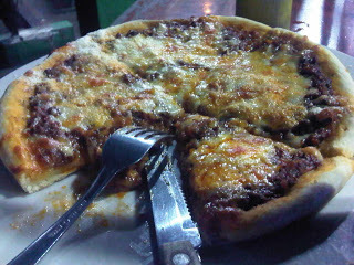 Toppingnya daging cincang rasa asin yang diselimuti keju mozarella dan taburan bubuk keju. Toppingnya ini nggak benar2 melekat di roti, bisa dipereteli dan sangat2 berasa daging cincang. Memang tepat banget buat meat lover.