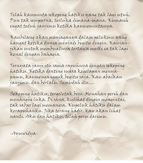 Naskah ini adalah pemenang ke-2 lomba menulis teenlit 30 hari 30 buku yang diadakan Bentang Belia.