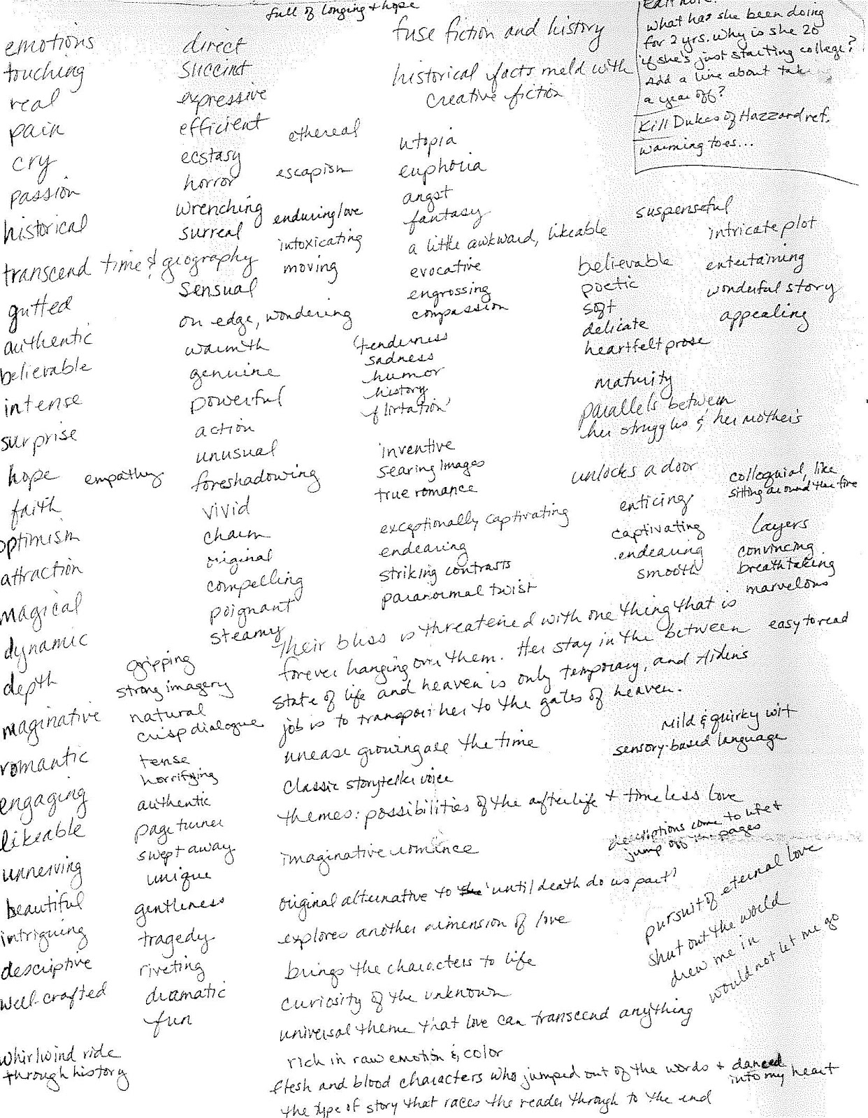 was published, I posted the manuscript on Authonomy, a writing community, in order to get feedback. When I was crafting query letters for agents, I made a list of words from the Authonomy comments in order to help me appropriately capture the feel of Between. I have carried that list in my purse for the last two years and now it is barely legible!