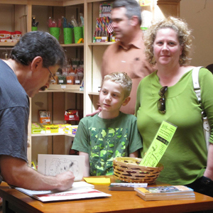 Like any book launch party, the main reason to have one is to show the world (or at least the party attendees) the new book, so of course I was available to sign the book. Here’s a photo of me doing that. I like this photo better than any I’ve ever seen of me signing a book (and I have to tell you I don’t really like any photos of me, but I put them in the back of my books and on Facebook and stuff, because other people tell me I have to), so I decided to include this one here as a novelty item.
