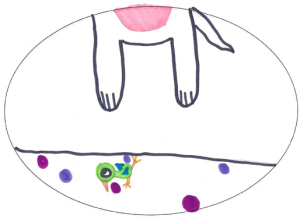 One day Dodo was walking up the stairs to Bunny’s bed. When he got to the top he was so tired he plopped down right in the center of the bed.