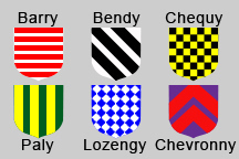 Here's some more heraldry basics. Sometimes shields had patterns on them. These patterns are called variations. A shield could have variations over the whole shield or only on part of it. The patterns are usually made with two colors. I chose not to have a pattern on my character's coat of arms because I thought it would be easier for the illustrator. But here's a list of the most common shield variation names: