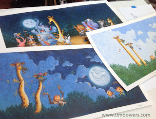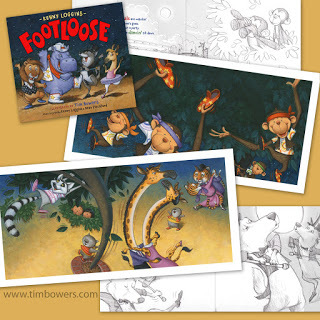 I just finished the artwork for an upcoming book, FOOTLOOSE by Kenny Loggins. The book is being published by Moondance Press/ Quarto Publishing Group. I'm really excited about this one and I think a lot of people are going to be putting on their dancin' shoes in October. The original song (FOOTLOOSE) has been re-written to become a fun story that takes place after hours, at the zoo. The art is full of animals, color, texture, fun and a whole lot of DANCIN'!