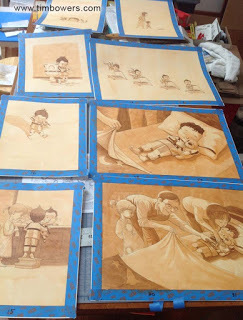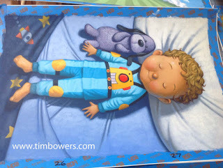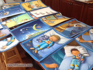 This was my table, somewhere under the shingles of drying illustrations. The images were at various stages of completion so Buddy's hair looks really dark on the bottom image, etc. I worked on several paintings at a time and all art started to finalize toward the end of the process....which is also called..."the deadline" (If all goes as planned). It was a fairly long process and sometimes hard to see the end when spending days painting little parts, adjusting colors and adding detail. But eventually, it all came together and a package with the final art of Buddy's Bedtime Battery traveled to Random House.
