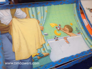 Here is the title page. The towel area on the left was used for copyright and publishing information. The title was placed on the wall, above the bathtub. Notice the pajamas are visible, just below the towel. I often use elements and story props to hint at what's coming on the following page(s).
