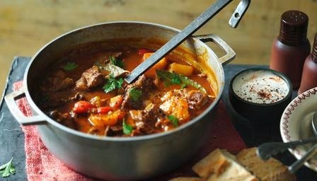 Many people think goulash is a stew, but they are wrong and should be ashamed of their ignorance. True goulash is a hearty soup of meet and vegetables. Add a slice of bread and it's a meal.