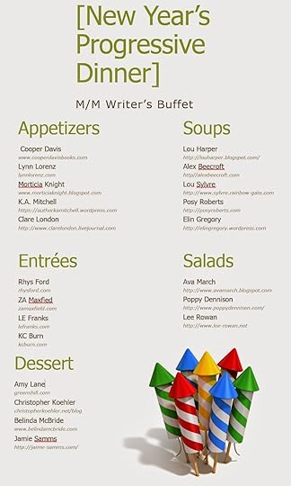 You can "choose your own dinner adventure" from appetizers, soup, salad, main dish and dessert, but those of you who visit and comment at each and every blog will be entered into a drawing for one of three (3) $35.00 gift cards to the venue of your choice: Amazon, Barnes and Noble, or All Romance Ebooks. For more info and clickable links, go HERE .