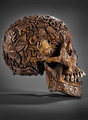 (Tibetan carved skull)scrimshaw |ˈskrimˌ sh ô|verb [ trans. ]adorn (whalebone, ivory, shells, or other materials) with carved or colored designs.nouna piece of work done in such a way.• the art or technique of producing such work :craftsmen demonstrate sailmaking and scrimshaw.ORIGIN early 19th cent.: of unknown origin; perhaps influenced by the surname Scrimshaw.