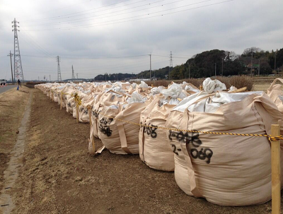While out on a run, I snapped the picture of bags that have been appearing around Abiko's beauty spot a few days before the second anniversary of March 11th. An army of bored middle-aged men were deployed with shovels and back hoes to remove the topsoil from 18km of verges of the walking and cycle path that snakes round the 18km of marsh known as Teganuma. I thought it was just the usual make-busy-work, end-of-the-financial-year-use-up-the-budget-before-they-cut-it routine in Japan, but apparently no, this was a matter of utmost importance. Although pictures of middle-aged men in back hoes makes for worse picture than bags of soil. At least the bags of soil convey an air of menace and mystery.