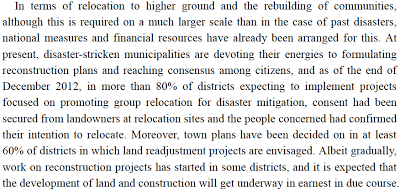 It's been two years since the disaster, there are still 316,000 evacuees displaced living on folks' floors or in freezing, stinking metal temporary homes, but don't worry, "construction will get underway in due course." Why, 80% of districts are expecting to implement projects. I can hear the gratitude in evacuee ghettos all around: "Hey, kids don't worry about living out here in this newtown shithole in a stinking metal box, 'disaster stricken municipalities are devoting their energies to formulating reconstruction plans and reaching consensus among citizens'."