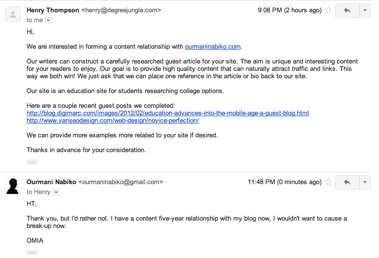 Sorry, what was I talking about again? Oh yeah. These two emails and my responses, reproduced for your pleasure here: