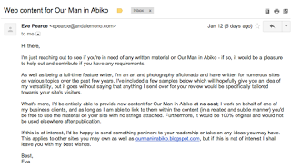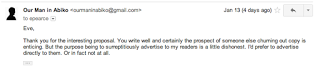 Hot on the heels of Scientologygate , in which The Atlantic prostituted its good name at the altar of a fast buck earlier this week, I can confirm that Our Man in Abiko has received two offers to do similar in the last couple of days, though the Johns were only offering free copy in exchange for a quickie link. Am I being puritanical in thinking such deals compromise my good name? I gave them short shrift, but it makes me wonder. Doing it for money doesn't seem so bad, as long as everyone knows up front there's no love involved.