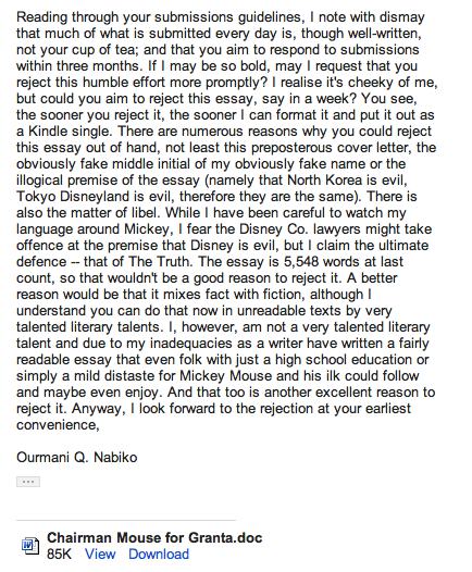 I think, comrades, you will agree with Our Man, that Chairman Mouse: A Tokyo Disneyland North Korea Fantasia marks a great leap forward in cover design for the Abiko Free Press, and punning titles, for which Our Man is indebted to editor Dan Ryan. But enough of all that. Want a free excerpt? Of course you do... here are the first 841 words of the essay...