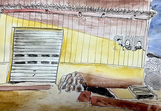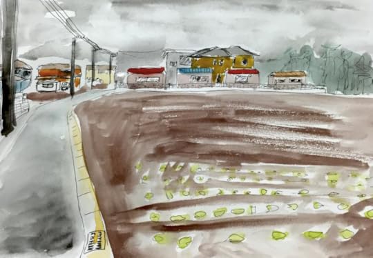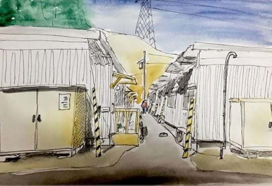 Here's my latest watercolour from last weekend's trip to Tohoku. This here is a temporary home "camp" on high ground in Rikuzentakata which was nearly wiped out in the tsunami. Each row houses five families. Reminded me of living in terraces in England, with all the advantages and disadvantages of living so close to each other.