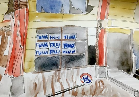Willpower (and remembering to set your alarm) can do amazing things. Thus armed, Our Man managed to roam the bits of Kesennuma scarred by the tsunami at 5:30am last Saturday. This is the result: an ink and watercolour sketch of a tsunami-gutted building that was being used as a warehouse for tuna. How long the boxes of fresh tuna had been in the building, Our Man couldn't say, but he found the place worthy of sketching. It's all very symbolic: The plucky fishing town that was adapting to life after the tsunami by carrying on regardless; or the doomed town living in the past, on course for extinction, just like the fish. Take your pick.