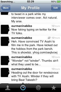Through Twitter. Our Man did his usual schtick -- we are all journalists now, he likes Twitter because you can broadcast your thoughts without having to clear them with a boss. Yadda, yadda, yadda. Naito-san sensibly didn't pursue the logic of this, that if Twitter represented something honest, democratic and unfiltered, what we were engaged in was, fake, meaningless and just plain dirty.