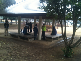 The camera crew re-adjusts and shoots us as we walk up the park path, Naito-san fake-talking to Our Man, Our Man fake-listening.