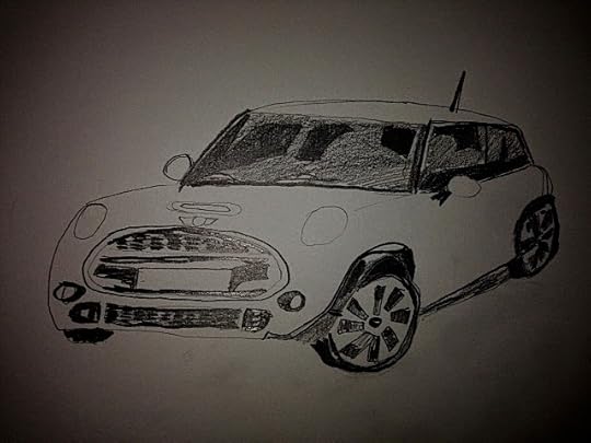 Why, look at that. It's a snap of a modern (prefer "modern" to the term "BMW") Mini Cooper in classic British racing green. Well, it will be when our Man finds his green pencil. It will probably be the main artwork on a kiddies English language textbook, if it makes it to the finish line.