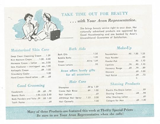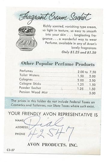Avon Products catalog, I believe the number on the rear panel indicates it is from 1957.