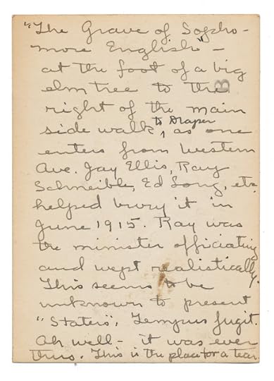 "The Grave of Sophomore English" - at the foot of a big elm tree to the right of the main side walk to Draper, as one enters from Western Ave. Jay Ellis, Ray Schneible, Ed Song, etc. helped bury it in June 1915. Ray was the minister officiating and wept realistically. This seems to be unknown to present "Staters." Tempus fugit. Ah well - it was ever thus. This is the place for a tear.