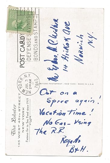Postcard featuring "The Lobster Oyster and Chop House," New York City, postmarked July 3, 1942: