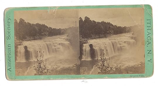 Stereo card , titled "American Scenery," featuring Genesee Falls, Ithaca New York.