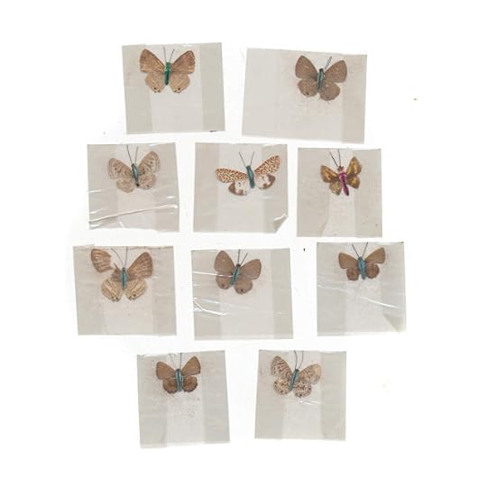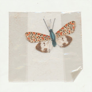 An unusual find today. Ten moths, dried and pressed, each individually wrapped in cellophane. If that were not unusual enough, the moths appear to have been altered. If you take a close look at their bodies, a small piece of colored paper has been trimmed to fit and mounted over the original.