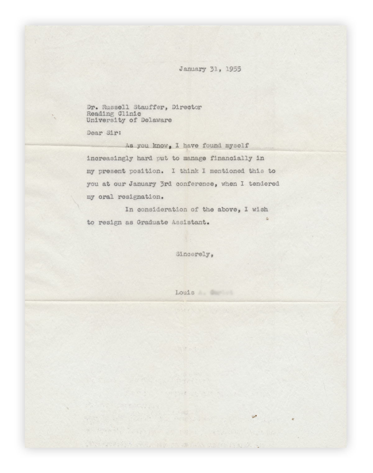 As you know, I have found myself increasingly hard put to manage financially in my present position. I think I mentioned this to you at our January 3rd conference, when I tendered my oral resignation.