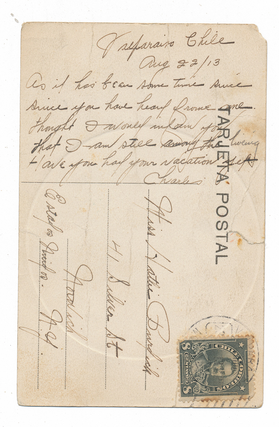 Postcard, dated Auguest 22, 1913, featuring Plaza Sotomayor, Valparaiso, Chile.