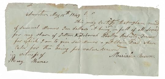 This may certify that I have received of Samuel Munro ten dollars, it being in full of all demand (?) for my share of (????) + Deborah Woolly's property (???) for which I am to give said Munro a (??) claim deed when called for this being for value received.