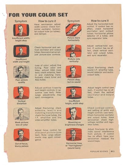 One page out of what I believe was a television manual published by Popular Science, no date that I can find. Seeing the fine-tuning instructions on the second page made me think of how people today will never fiddle with dials to get the perfect picture in the same way.