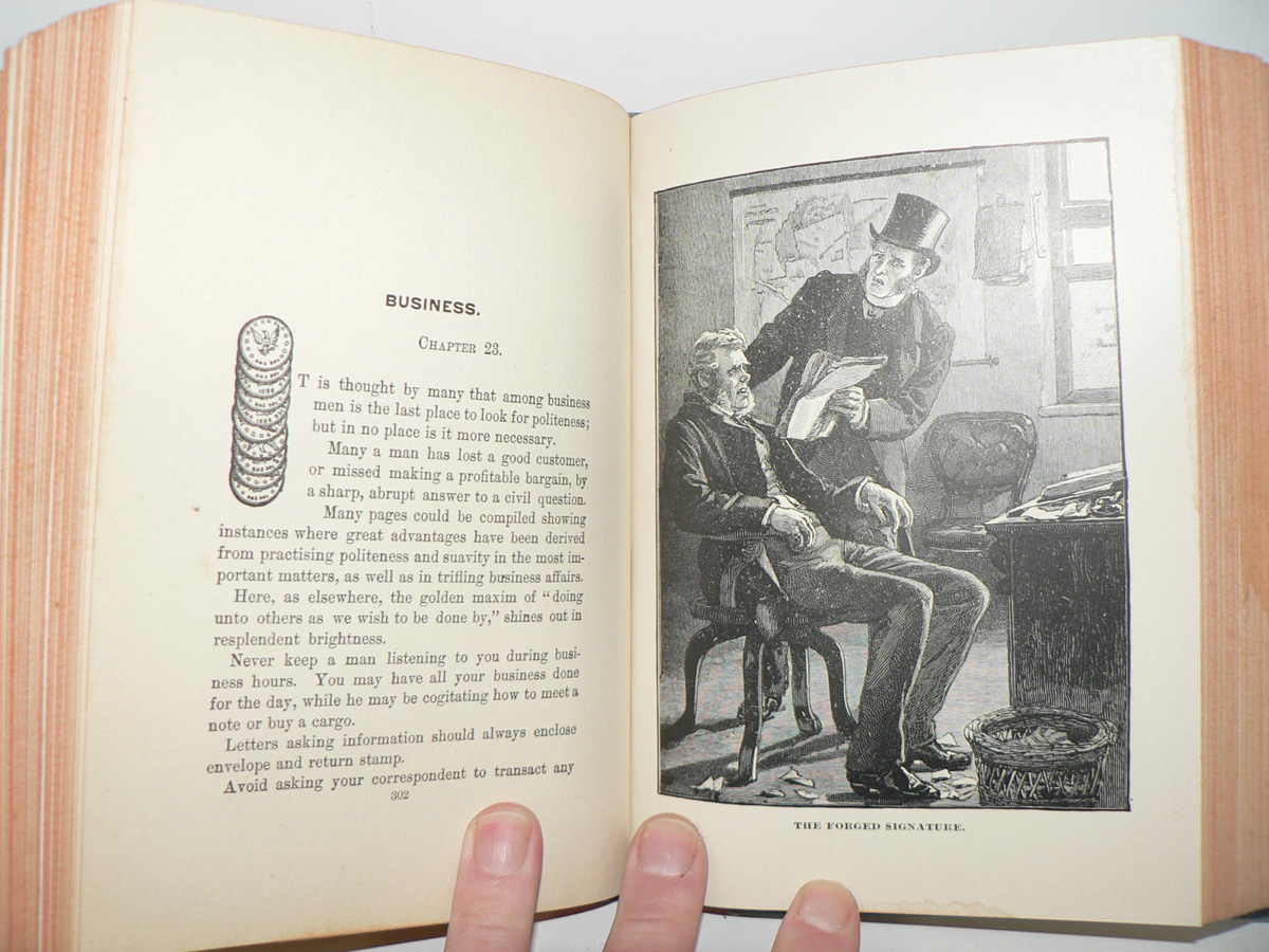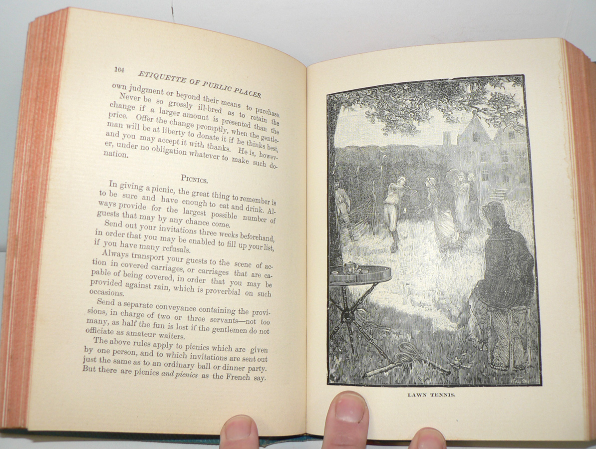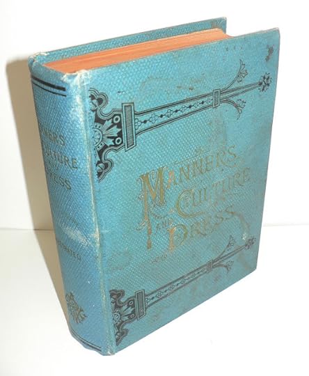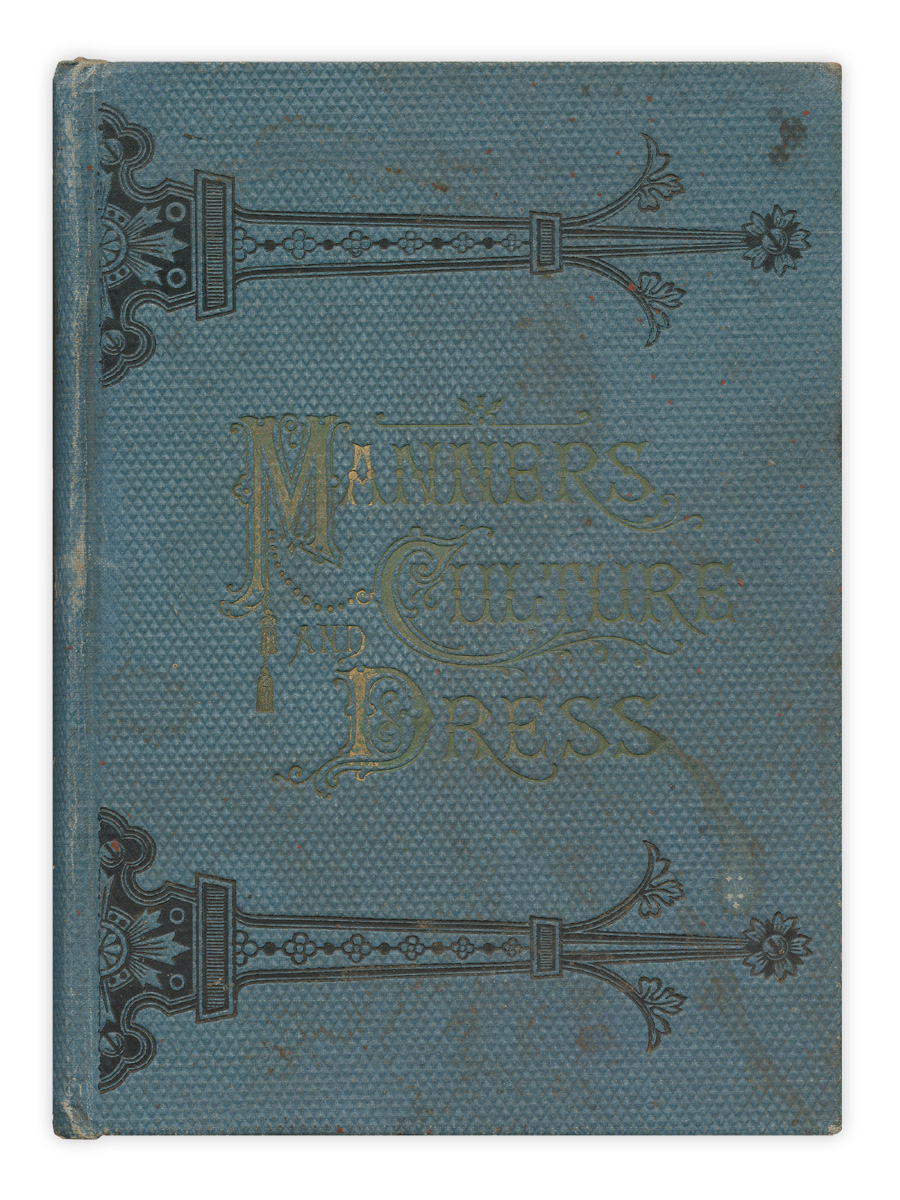 The book is "Manners: Culture and Dress of the Best American Society, including Social, Commercial and Legal Forms, Letter Writing, Invitations; also Valuable Suggestions on Self Culture and Home Training" by Richard A. Wells. Published by King, Richardson and Co., 1986.