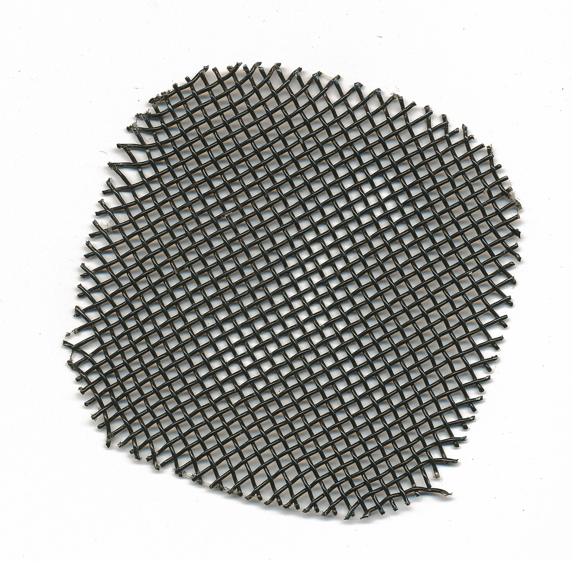 It's metal, painted black. Weaved wire mesh. Somewhat flexible, but not flimsy. About two inches square. Your guess is as good as mine.