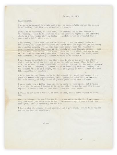 I am working. This time for the University. I am the receptionist at the Reading Institute for Children Who don't Know the Alphabet (in sanscrit) and retarded Adults. It is very dull here except when the children do some perverted thing like stop up the toilet, or walk through windows. Then it gets very interesting. The woman I work for is a bitch, and she hates me, but then so does everybody else. Every day, all over the world, mankind observes, religiously, fifteen minutes of hate Alice.