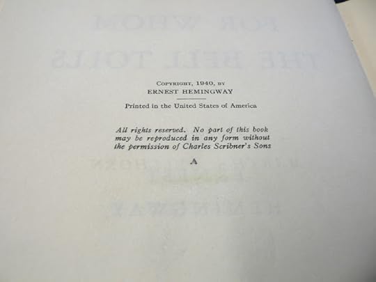 You may have noticed that there was no post yesterday. I've been sick since Saturday, and for the first time in a very long time, I didn't come into work yesterday. To make it up to you, I'm giving away this first edition of Hemingway's "For Whom The Bell Tolls" -