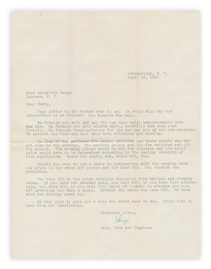 You take 25% of the gross receipts including both matinee and evening shows. If you have $50 advance sale, you take 40%; if you sell $100 worth of tickets in advance you take 40% providing you have a dance. Without the dance you take 35%. We know what our drawing power is.