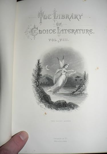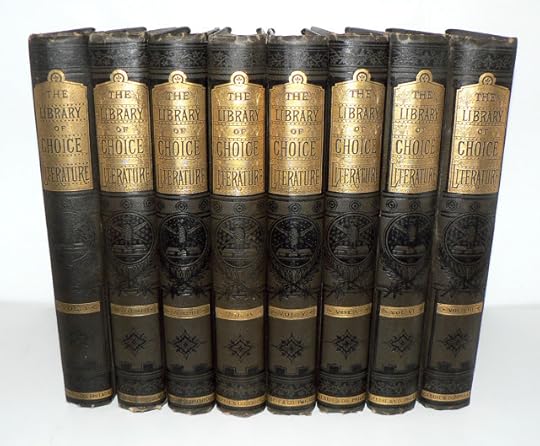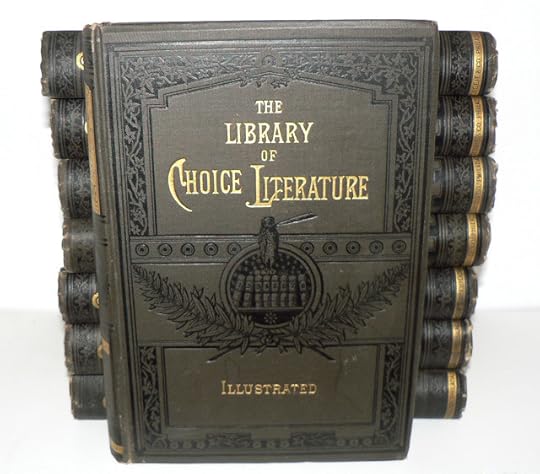Today's giveaway includes this handsome eight volume set, "The Library of Choice Literature," published by Gebbie and Co., 1882 Filled with illustrations, 66 steel engravings. Includes a wide range of authors; George Eliot, Charles Reade, John Keats, Lord Byron, Sophocles, Henry Fielding, Charles Dickens, Sir Walter Scott, Mary Shelley, Wordsworth, Matthew Arnold, Shakespeare... well, you get the picture. Gilt all edges, lovely decorated covers - just a nice old set.